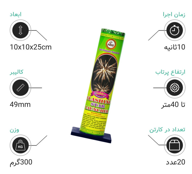 - اگر به دنبال ایجاد یک نمایش نورافشانی شگفتانگیز در جشنهای خود هستید، لانچر فلشی از دسته هواییها انتخابی بینظیر است! این محصول با زمان اجرای ۱۰ ثانیه و پرتاب به ارتفاع ۴۰ متری، ترکیبی از ستارگان درخشان و جلوههای ویژه را در آسمان به نمایش میگذارد.