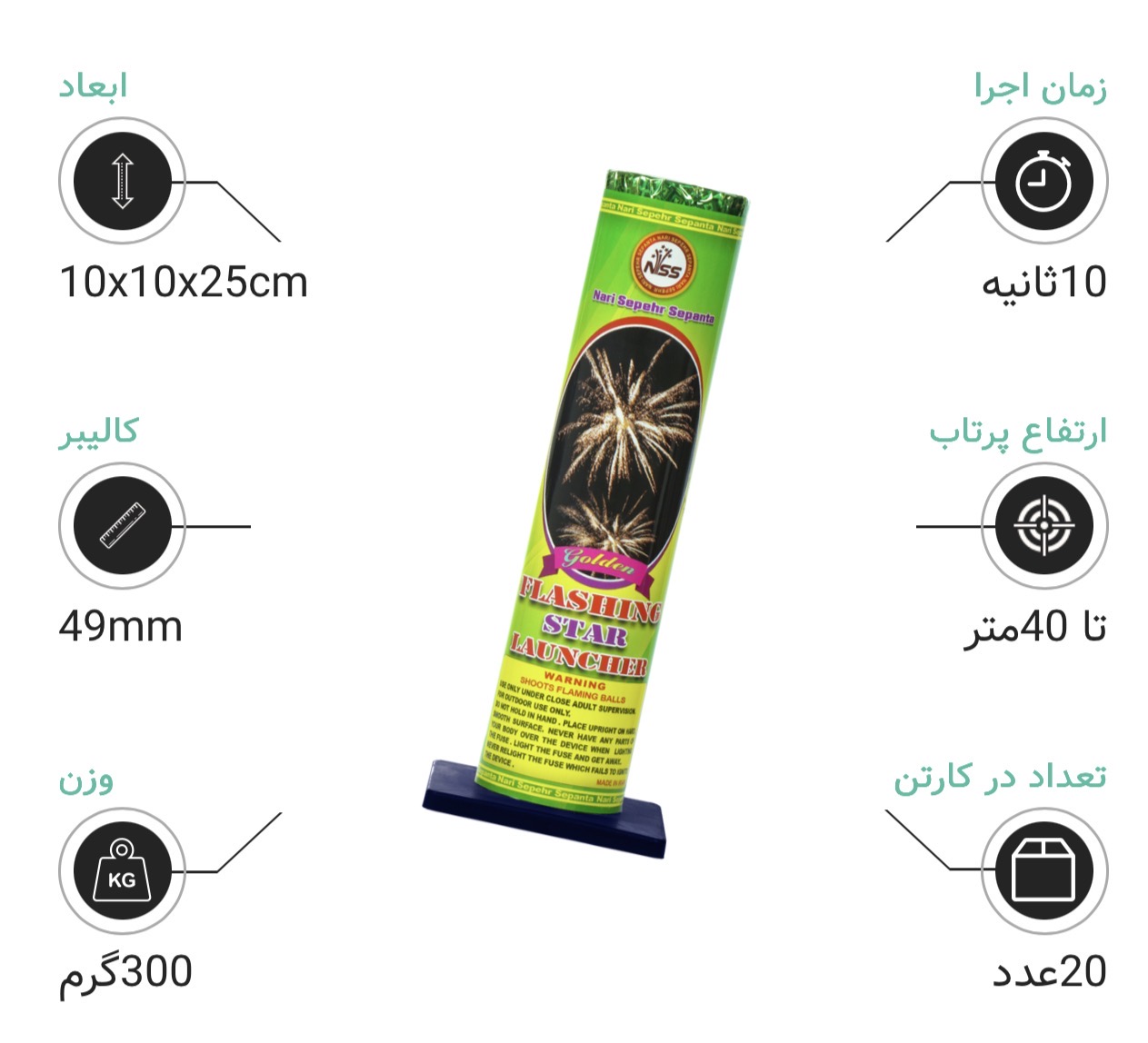 - اگر به دنبال ایجاد یک نمایش نورافشانی شگفتانگیز در جشنهای خود هستید، لانچر فلشی از دسته هواییها انتخابی بینظیر است! این محصول با زمان اجرای ۱۰ ثانیه و پرتاب به ارتفاع ۴۰ متری، ترکیبی از ستارگان درخشان و جلوههای ویژه را در آسمان به نمایش میگذارد.