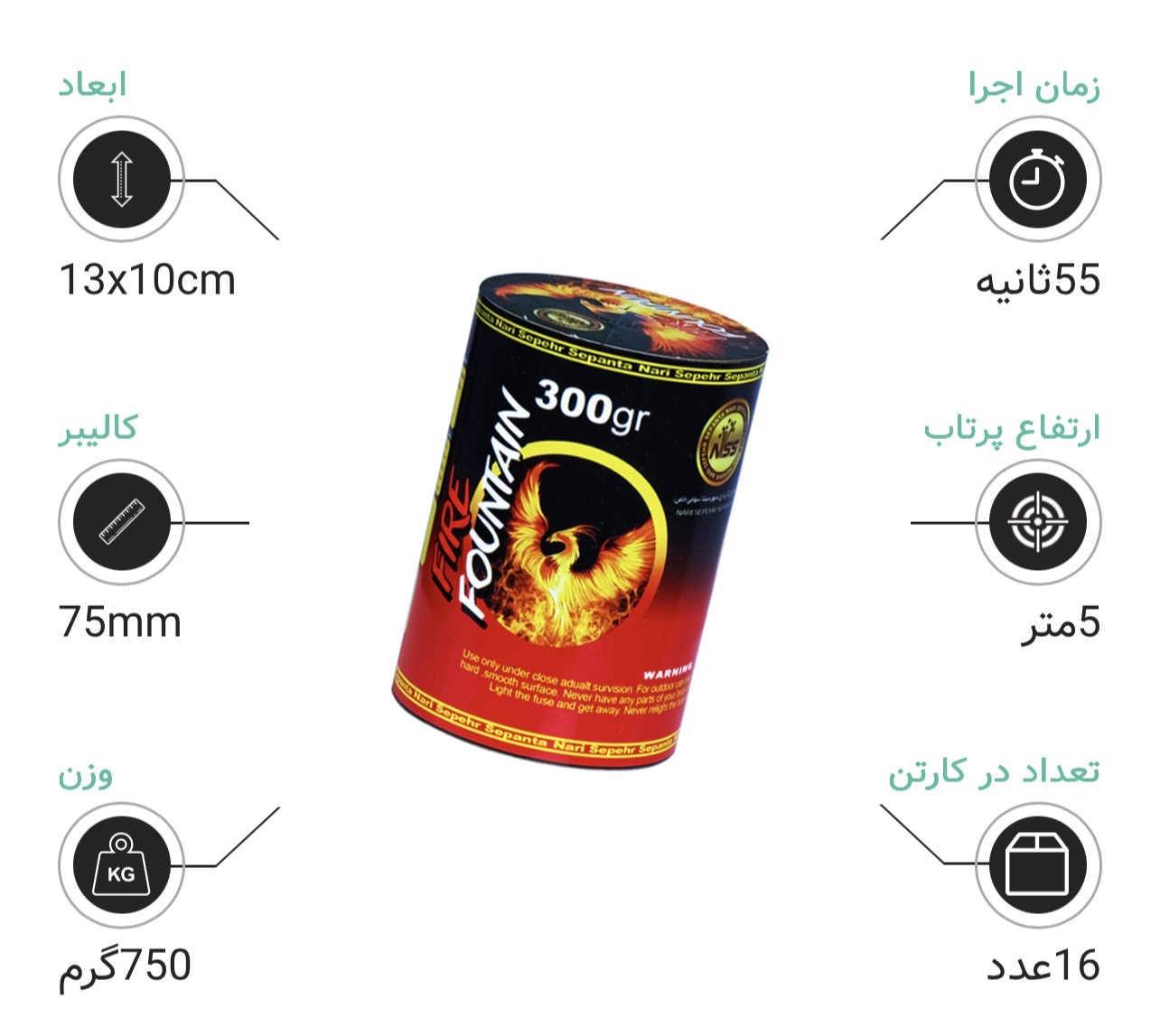 - با ابعاد 10x13 سانتیمتر و وزن 750 گرم، آبشار فونیکس 300 گرمی برای استفاده در فضاهای باز بسیار مناسب است و بهراحتی قابل حمل و استفاده است. این محصول به هر جشن شما جلوهای خاص و بینظیر میبخشد.