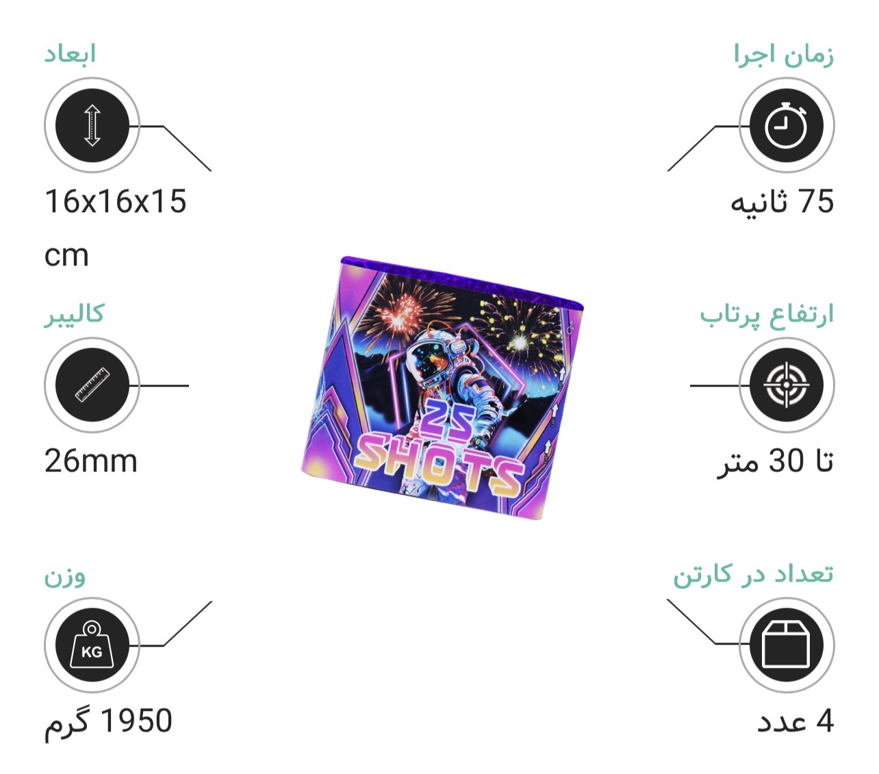 - اگر به دنبال یک تجربه نورافشانی فوقالعاده برای جشنهای خود هستید، 25 شوت 1 اینچ از دسته هواییها انتخابی بینظیر است! این محصول با 75 ثانیه زمان اجرای هیجانانگیز و شلیکهای قدرتمند، نمایشی شگفتانگیز از نور و رنگ را تا ارتفاع 30 متر برای شما و مهمانانتان به ارمغان میآورد.
