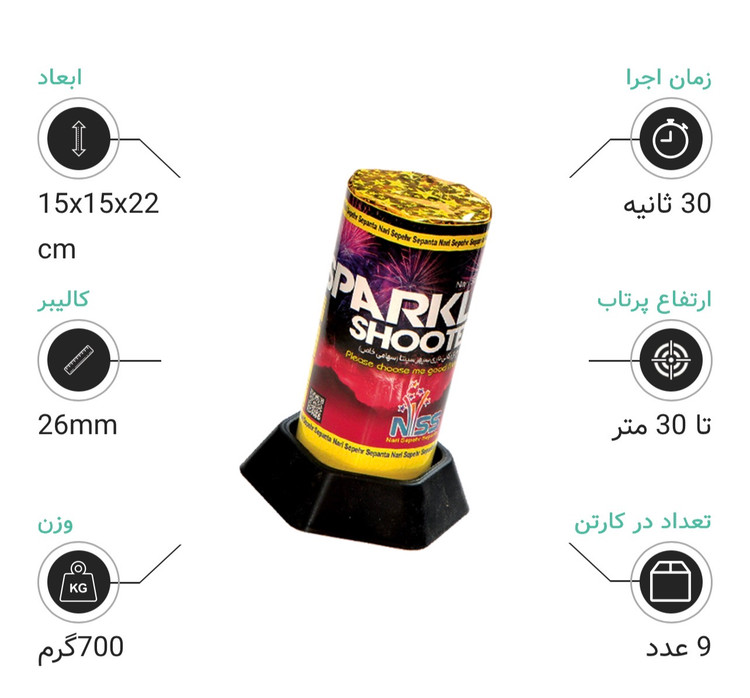 - برای یک تجربه نورافشانی هیجانانگیز و تماشایی، 7 شوت 1 اینچ از دسته هواییها گزینهای عالی است! این محصول با زمان اجرای 30 ثانیه و پخش رنگها تا ارتفاع 30 متر، لحظات شاد و به یادماندنی برای شما و مهمانانتان میسازد.